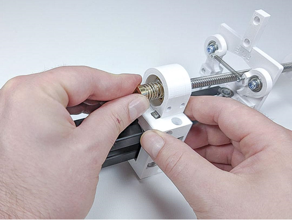 Dann positionieren Sie Teil FG-B so, dass die Trapezgewindespindel parallel zum Aluminium-Profil steht. Dann festschrauben.