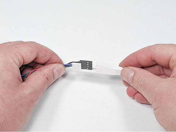 Geflechtschlauch zusammendrücken und Teil SD-D mit drei Holzschrauben 2,5×12 befestigen. Ausrichtung siehe Bild.