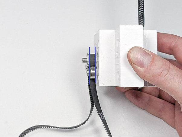 Die zwei Kugellager werden jeweils mit einer Zylinderschraube M4x10 in die dafür vorgesehene Bohrung geschraubt. Ziehen Sie dabei an dem Zahnriemen, sodass er eng am Riemenrad anliegt.