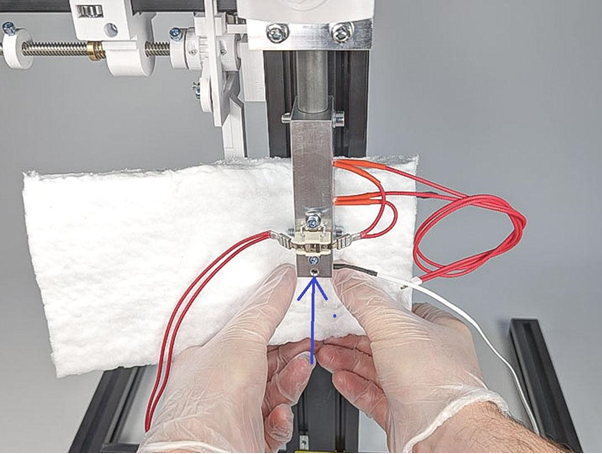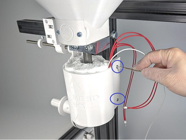 Den Thermistor in die dafür vorgesehene Bohrung stecken und mit einer Madenschraube M4 gegen herausziehen sichern. ACHTUNG: Die Madenschraube nur leicht fest drehen, sonst kann der Thermistor beschädigt werden.