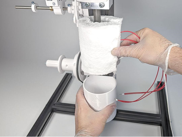 Die Keramikfasermatte um das Heizelement legen. Dabei die Flachsteckhülse in das Loch in der Keramikfasermatte einführen.
