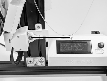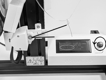 08.2.4 Erfolgt die Abkühlung durch den Lüfter zu schnell oder ist die Extrusionsgeschwindigkeit zu klein, kann sich das Filament verwinden, was den folgenden den Ablauf erschwert. In diesem Fall lesen Sie Punkt 8 weiter unten. Erfolgt die Abkühlung zu langsam, dann kann das Filemant am Sensor kleben bleiben. Dann „springt“ der Sensor über das Filament. In diesem Fall erhöhen Sie die Drehzahl des Lüfters und stellen sicher, dass er geneigt ist, sodass er auf den Sensor bläst.