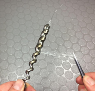 12.14 Halten Sie die Extruderschnecke am kalten Ende fest. Nun kann der Kunststoff mit einer Pinzette oder Zange abgezogen werden. Warten Sie hierzu eine kurze Zeit ab, bis die Schnecke etwas abkühlt, sodass der Kunststoff zäh wird. Dann kann man meistens den Kunststoff in einem Stück abziehen. Beginnen Sie am kalten Schaft. An der Spitze der Schnecke kühlt diese zuletzt ab. Es kann hilfreich sein, mit dem Mund etwas Luft auf den Kunststoff zu pusten, dann wird er an den gewollten Stellen schneller zäh. Wenn es verkohlte Stellen oder sonstige Anhaftungen gibt, kann es nötig werden die Schnecke abzuschleifen und neu zu polieren.