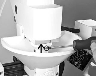 12.24 Die Kupplung nach oben ziehen, sodass das Axiallager kontakt zur Motorhalterung hat. Unbedingt darauf achten, dass das Axiallager die Motorhalterung berührt, also die Kupplung in der höchstmöglichen Position ist. Dann die kleine Schraube in der Kupplung ganz leicht anziehen. Diese dient lediglich dazu, die Kupplung in Position zu halten, bis wieder Kunststoff in der Extruderschnecke ist.