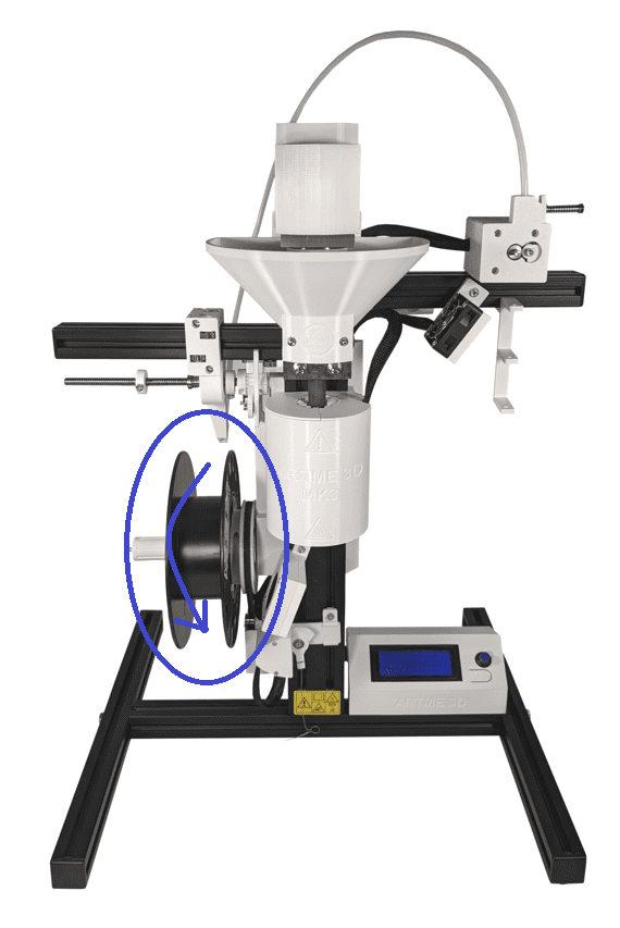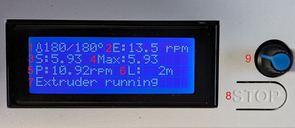 Wenn die Temperatur über 150°C liegt, beginnt der Extruder Motor zu drehen. Prüfen Sie die Drehrichtung, siehe Bild. Nach ca. 12 bis 14 Minuten sollte die Temperatur von 180°C erreicht sein. Dann piepst die Steuerung zwei Mal. Nun sollte die Temperatur stabil bei 180°C bleiben und nur wenig schwanken. Mit drücken der Stopp-Taste am Display können Sie jederzeit alle Funktionen und Bewegungen stoppen.
