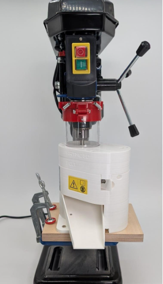 Standbohrmaschinen sind gut geeignet, da diese für lange Betriebsdauern ausgelegt sind und über eine Drehzahleinstellung verfügen. Auch kann der Pelletierer gut befestigt werden, indem man diesen mit Schraubzwingen sichert.
